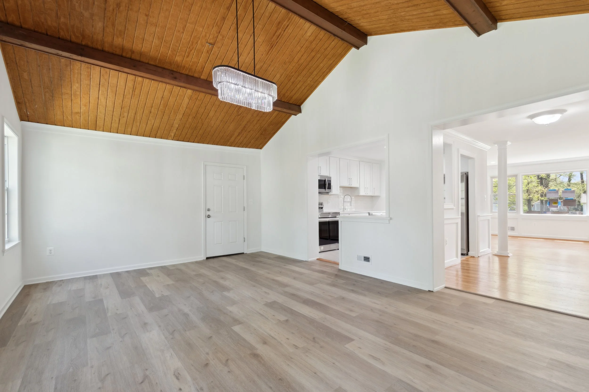 Beyond the kitchen, an expansive living area offers even more room to relax or entertain. The wood-paneled ceiling adds warmth and character, while another elegant chandelier elevates the space. Whether hosting guests or curling up with a good book, this room is as versatile as it is inviting.