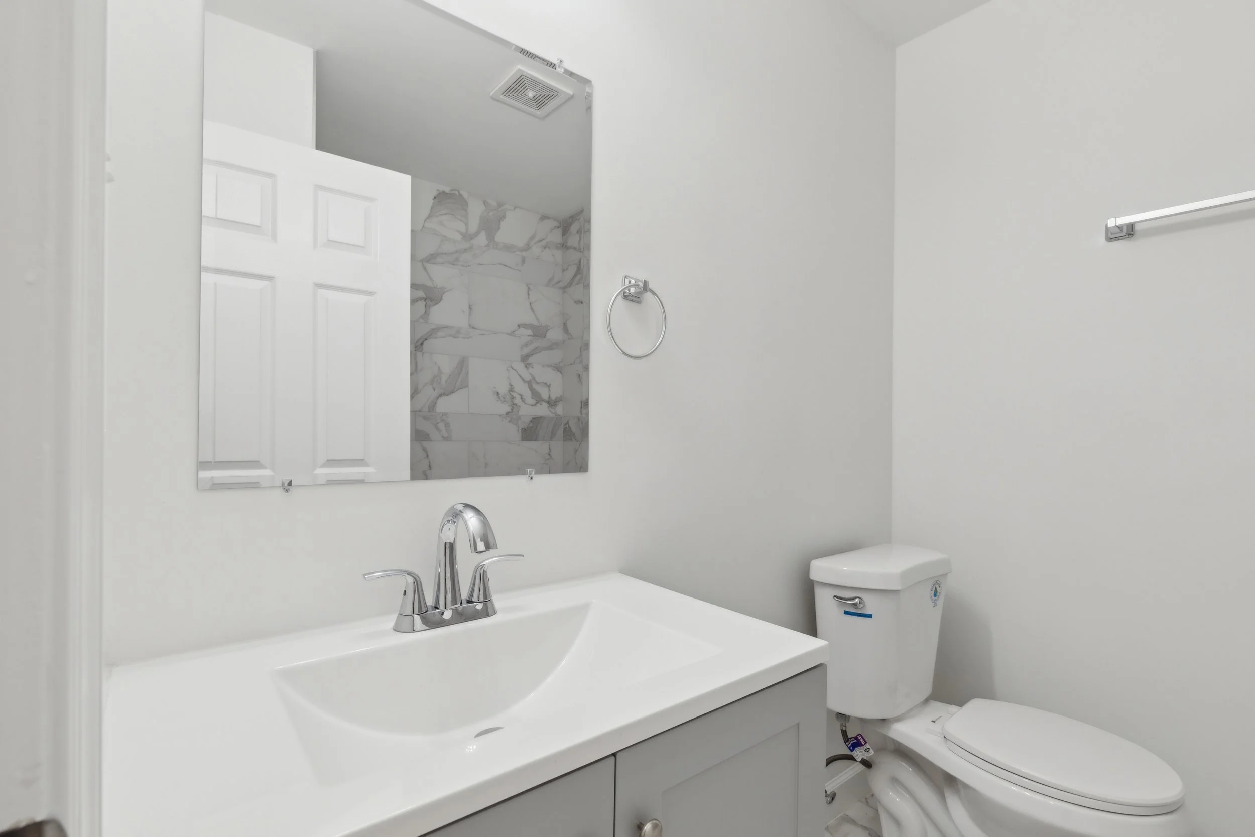 The guest bathroom is another thoughtfully designed space, featuring a gray vanity topped with quartz, brushed steel fixtures, and a stylish marble backsplash in the shower/tub combination. It’s the perfect spot to unwind at the end of a long day.