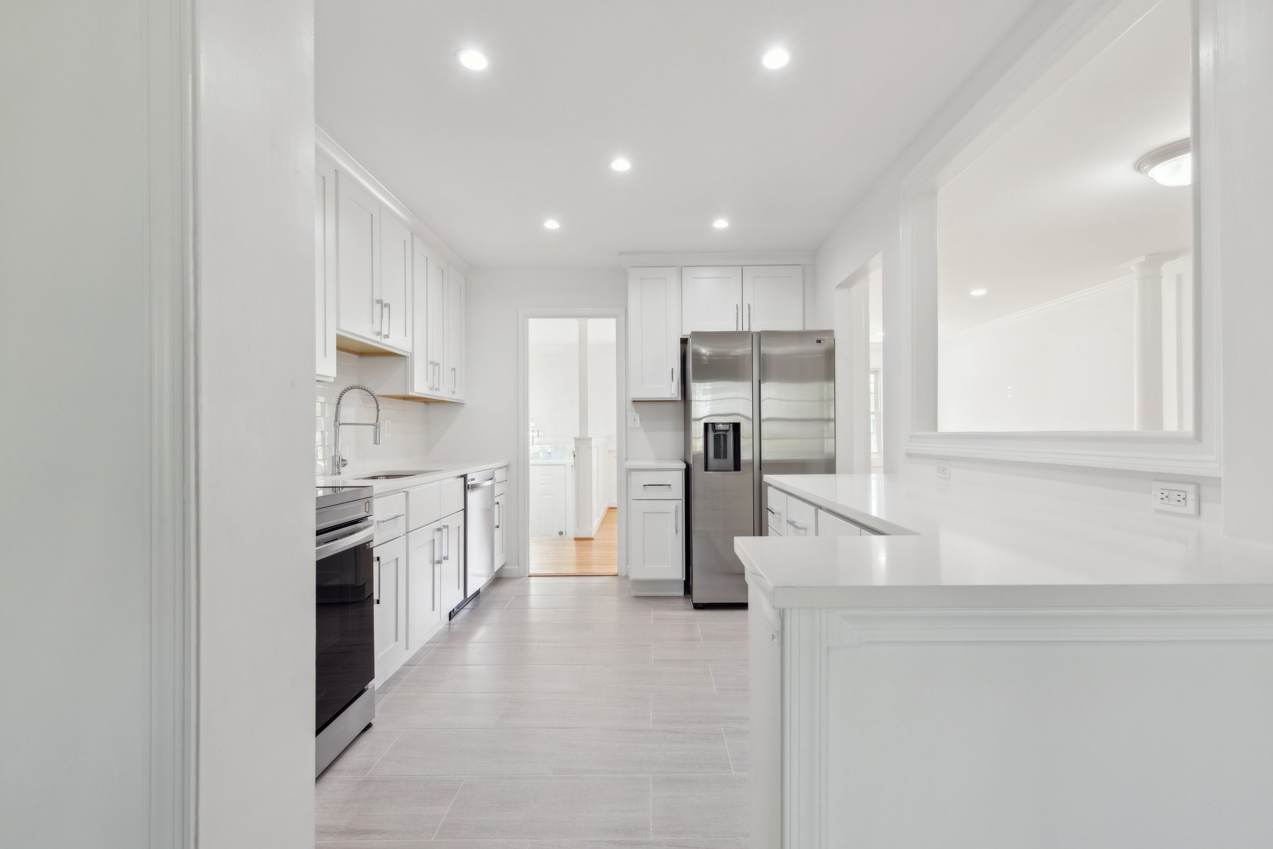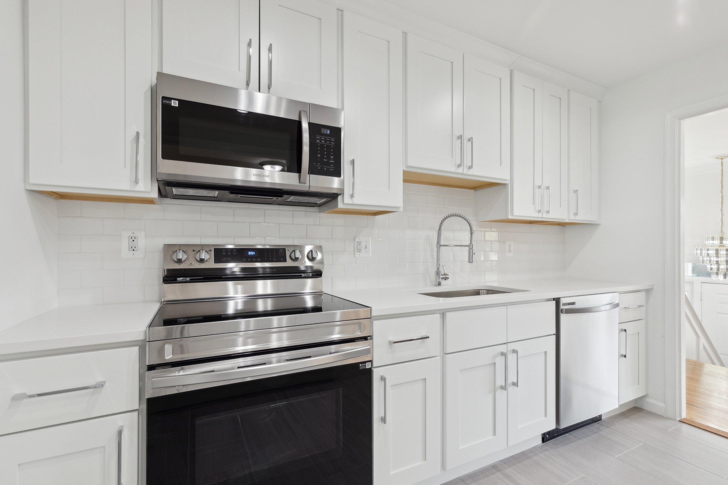 The kitchen truly shines as one of the home’s standout features. Crisp white cabinetry, white quartz countertops, and stainless steel appliances create a clean, timeless look. With abundant storage and generous counter space—including an entire area dedicated to meal prep—it’s both beautiful and highly functional.