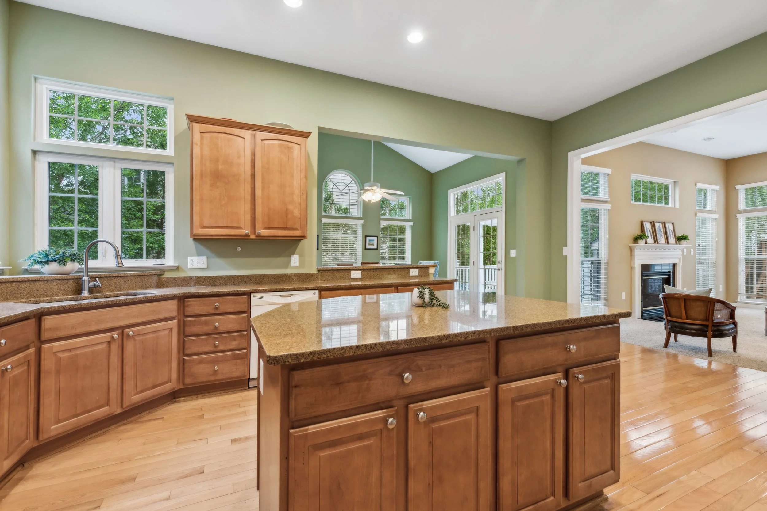 Just off the kitchen, a bright sunroom offers a relaxed dining option with floor-to-ceiling windows that flood the space with natural light. A convenient pass-through window connects the two areas, making weeknight meals and entertaining effortless. The natural light throughout this home was a dream to photograph, highlighting architectural details and enhancing every room.