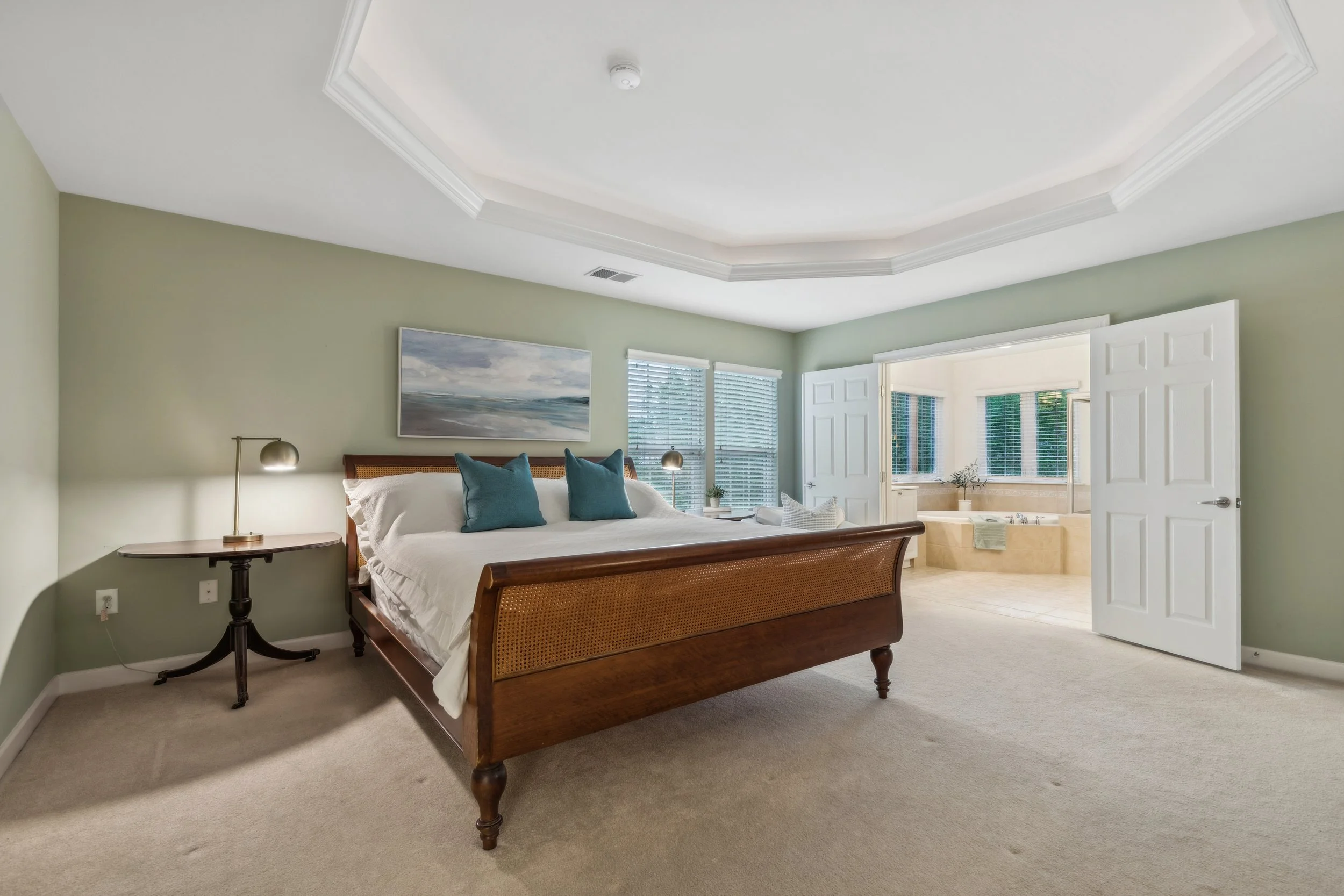 The primary bathroom complements the suite beautifully, featuring double vanities, a spacious stand-up shower, and a luxurious soaking tub. The spa-like atmosphere makes it easy to envision unwinding here, surrounded by calm and comfort.