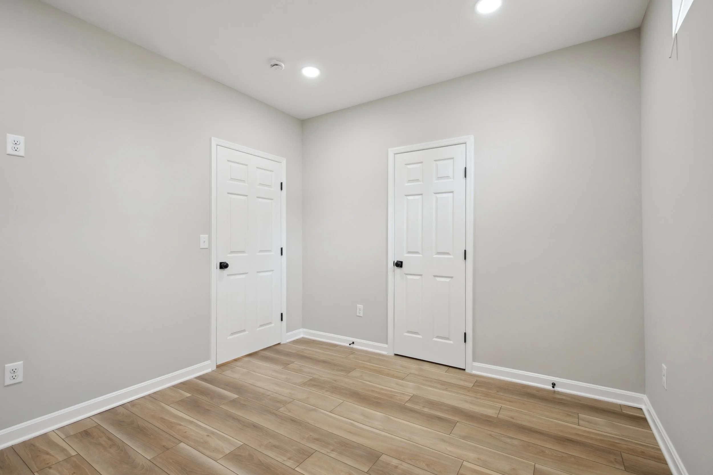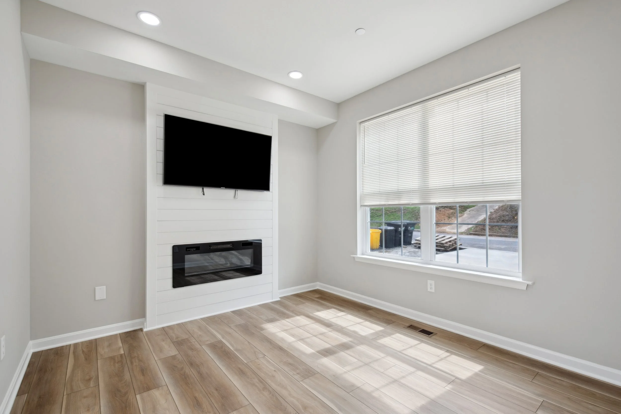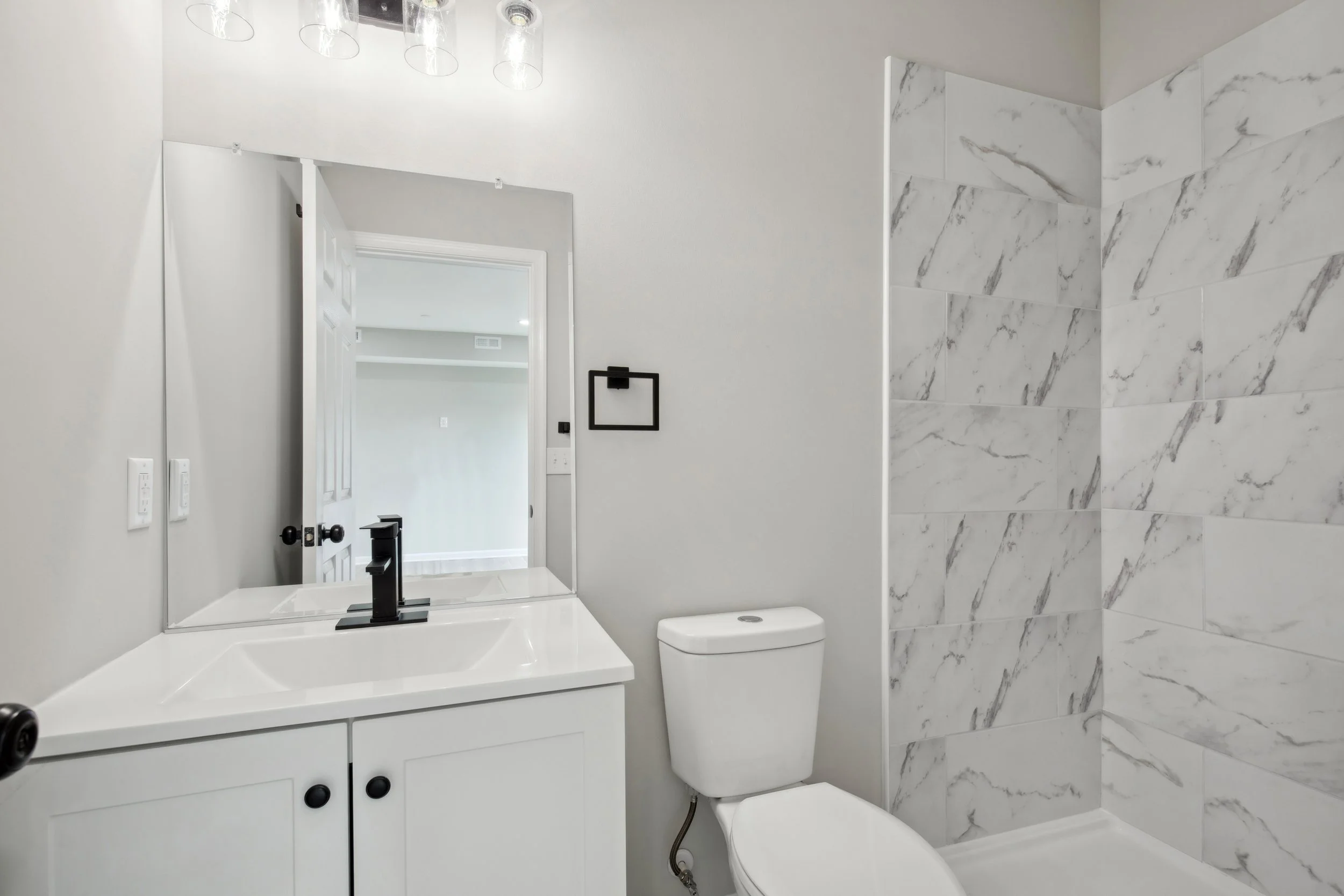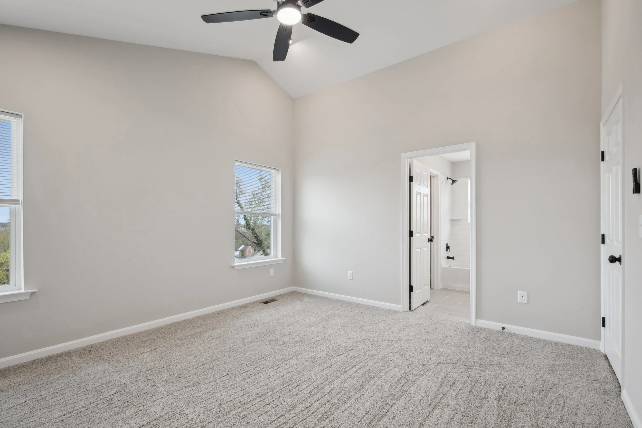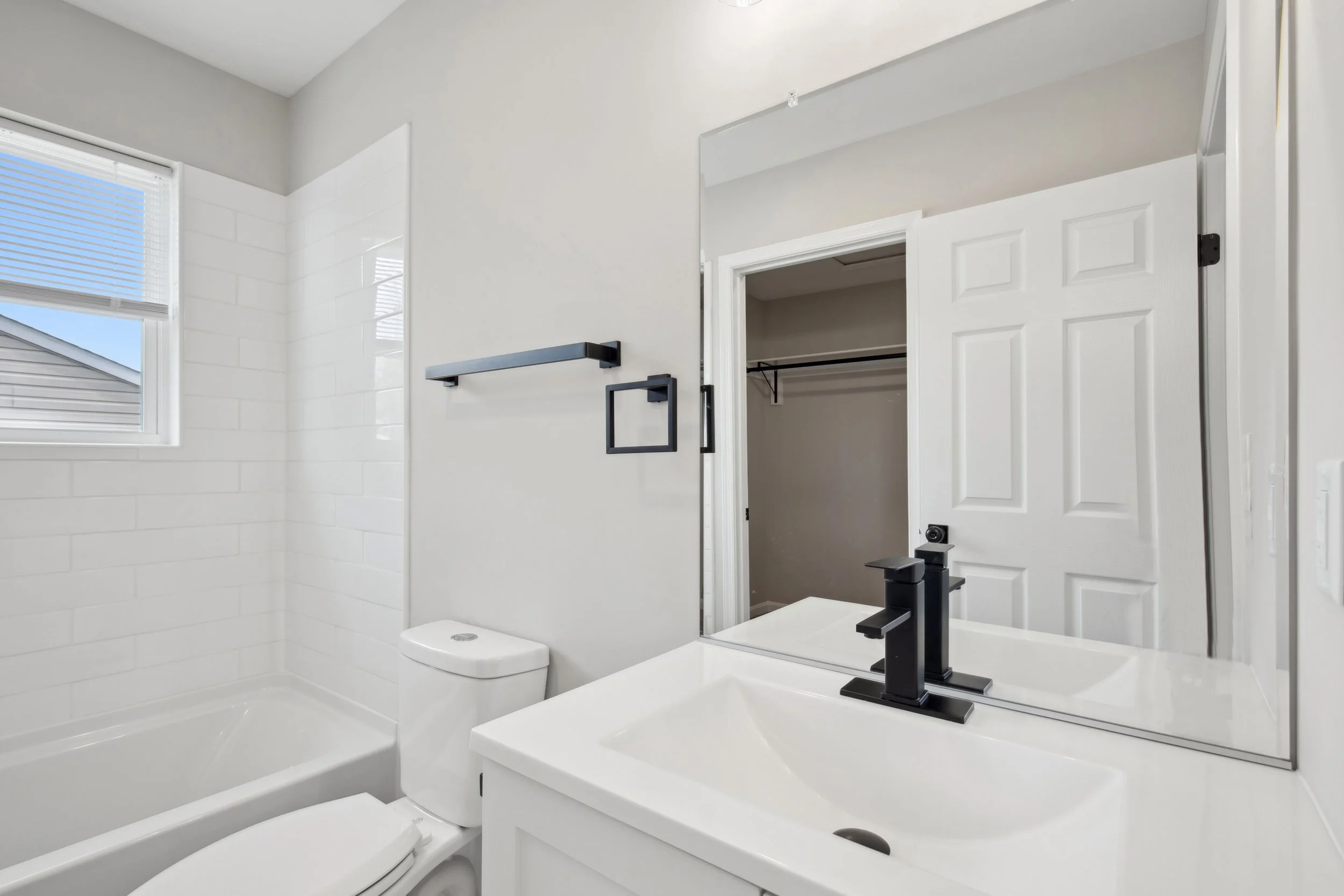 Upstairs, the luxurious details continue. The primary bedroom is a standout, with vaulted ceilings that create an airy, open feel. The room is generously sized, easily accommodating a king bed along with a comfortable sitting area. The primary bathroom is equally impressive, showcasing classic subway tile in the shower paired with brushed black steel fixtures for a clean, modern look.