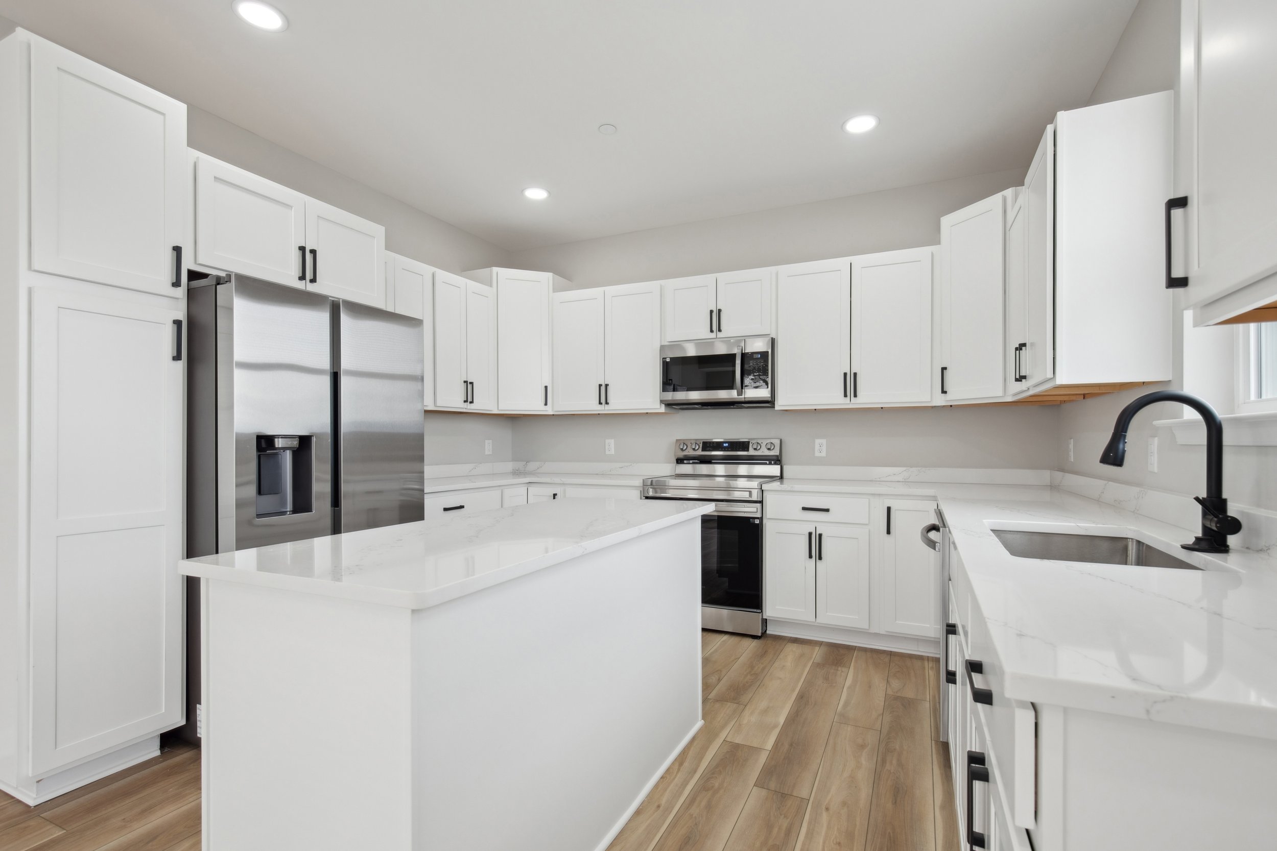 Upon entering, you’re greeted by a striking staircase to the left and a formal living room to the right. The living room features a gorgeous gas fireplace that instantly makes the space feel warm and welcoming. Just beyond, the home flows seamlessly into the dining area and the fully remodeled kitchen. This kitchen is truly a dream for any home chef, featuring sleek white cabinetry, stainless steel appliances, and stunning quartz countertops. Black brushed steel hardware provides a bold contrast, while the spacious island offers the perfect place for meal prep, casual dining, or gathering with friends and family.
