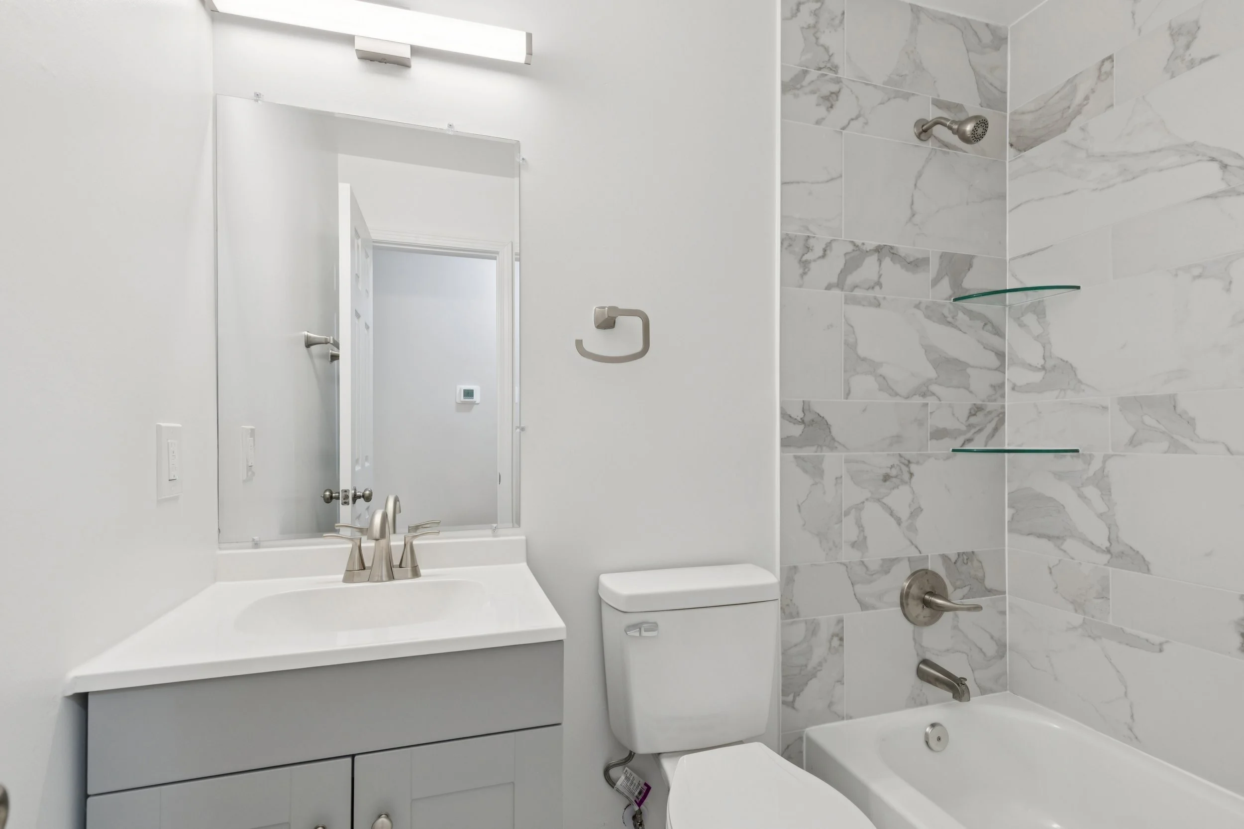 The attention to detail continues into the bathrooms, where the updates feel both timeless and fresh. In the primary bathroom, a sophisticated gray vanity sits beneath white countertops and brushed steel hardware. The shower and tub combination is finished with a marble-inspired backsplash that adds a touch of luxury to the daily routine.