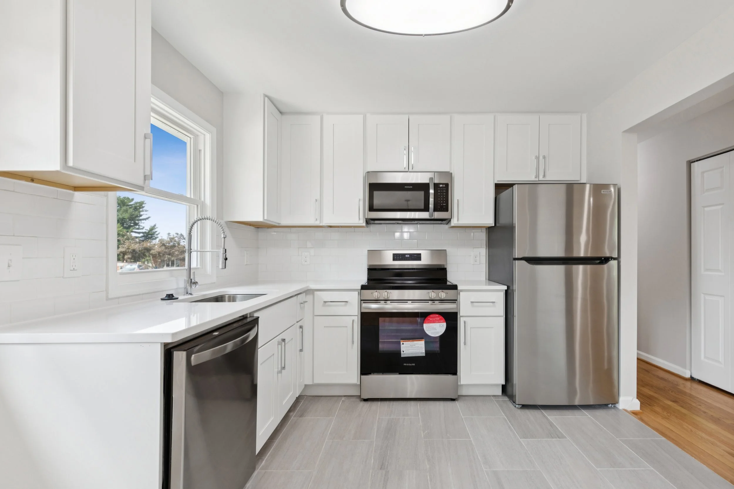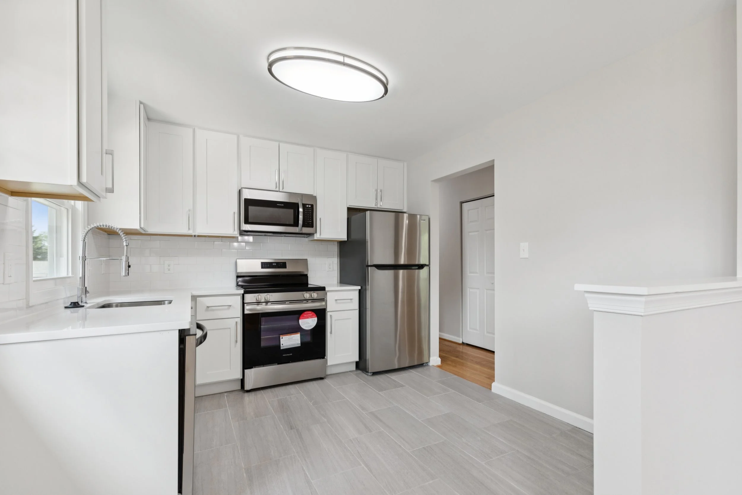 Abundant sunlight pours through large windows on both sides of the main level, creating a bright atmosphere that enhances the sense of scale. The layout flows effortlessly from the spacious living room into the dining area and kitchen, forming an open environment that practically begs for lively dinner parties and holiday gatherings. In the kitchen, the renovation shines through gorgeous white cabinetry paired with modern stainless steel appliances and fixtures. A clever half wall currently defines the space while offering a hint of potential for future storage or custom additions for a dedicated home chef.