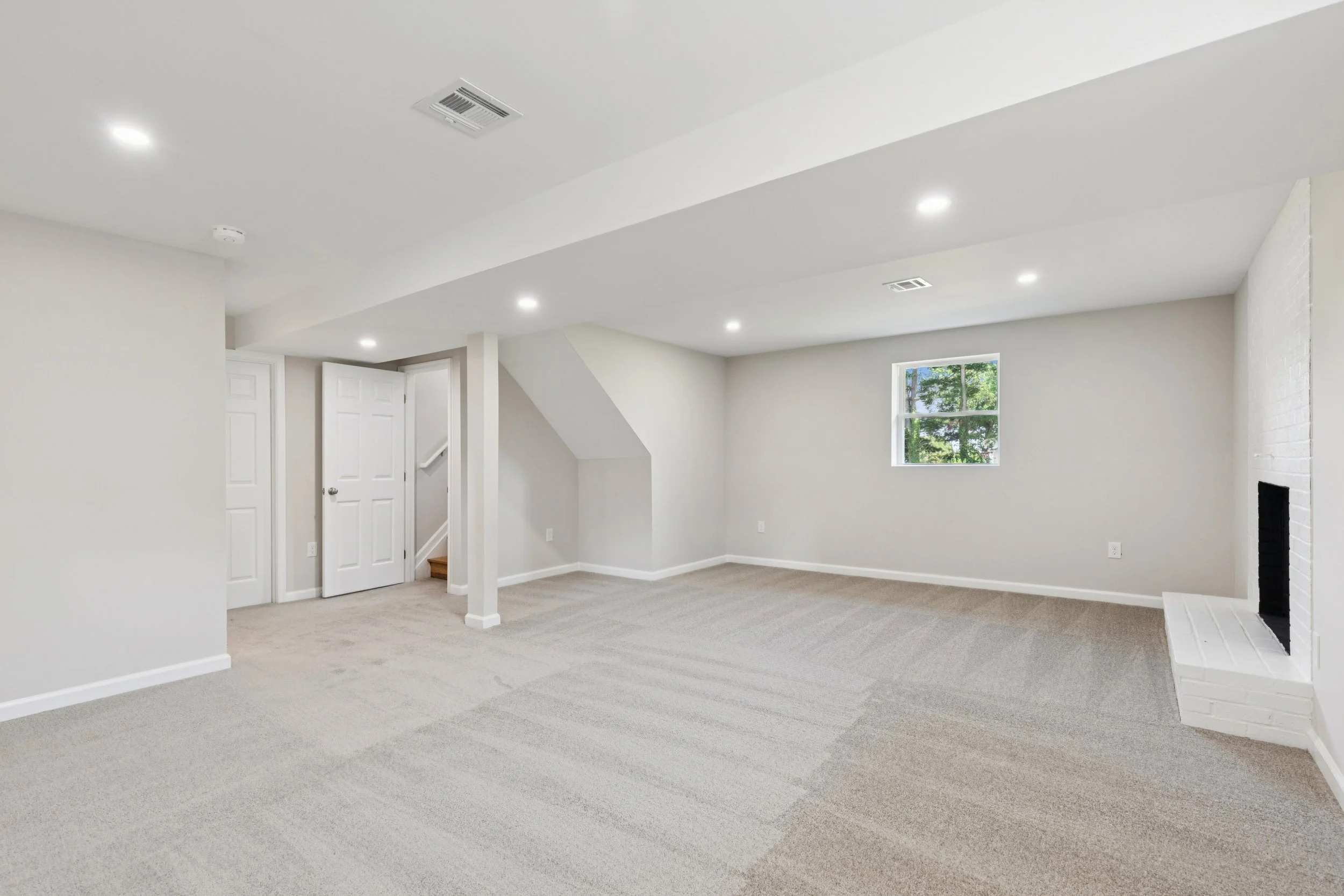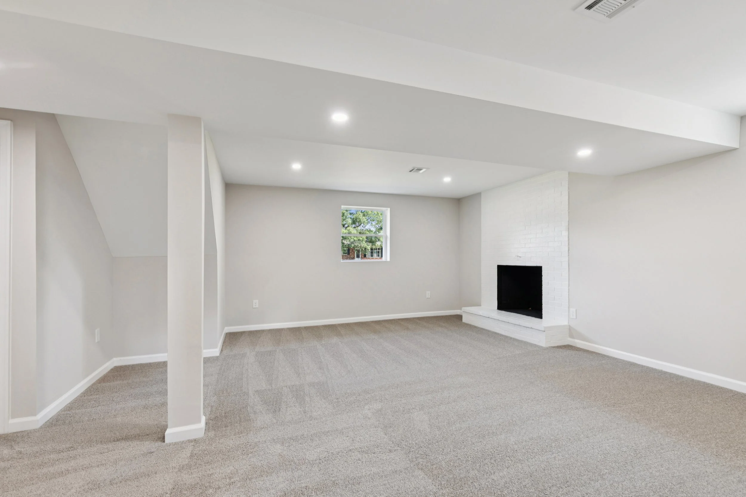 Descending to the lower level reveals a surprisingly versatile retreat centered around a classic fireplace. The hearth is framed by stylish white brick that brings a contemporary edge to the cozy architecture. This expansive area offers enough room to house a media center alongside a home office or a vibrant playroom. With a private door at the base of the stairs, this level even holds the potential to become a separate apartment suite with just a few modifications.