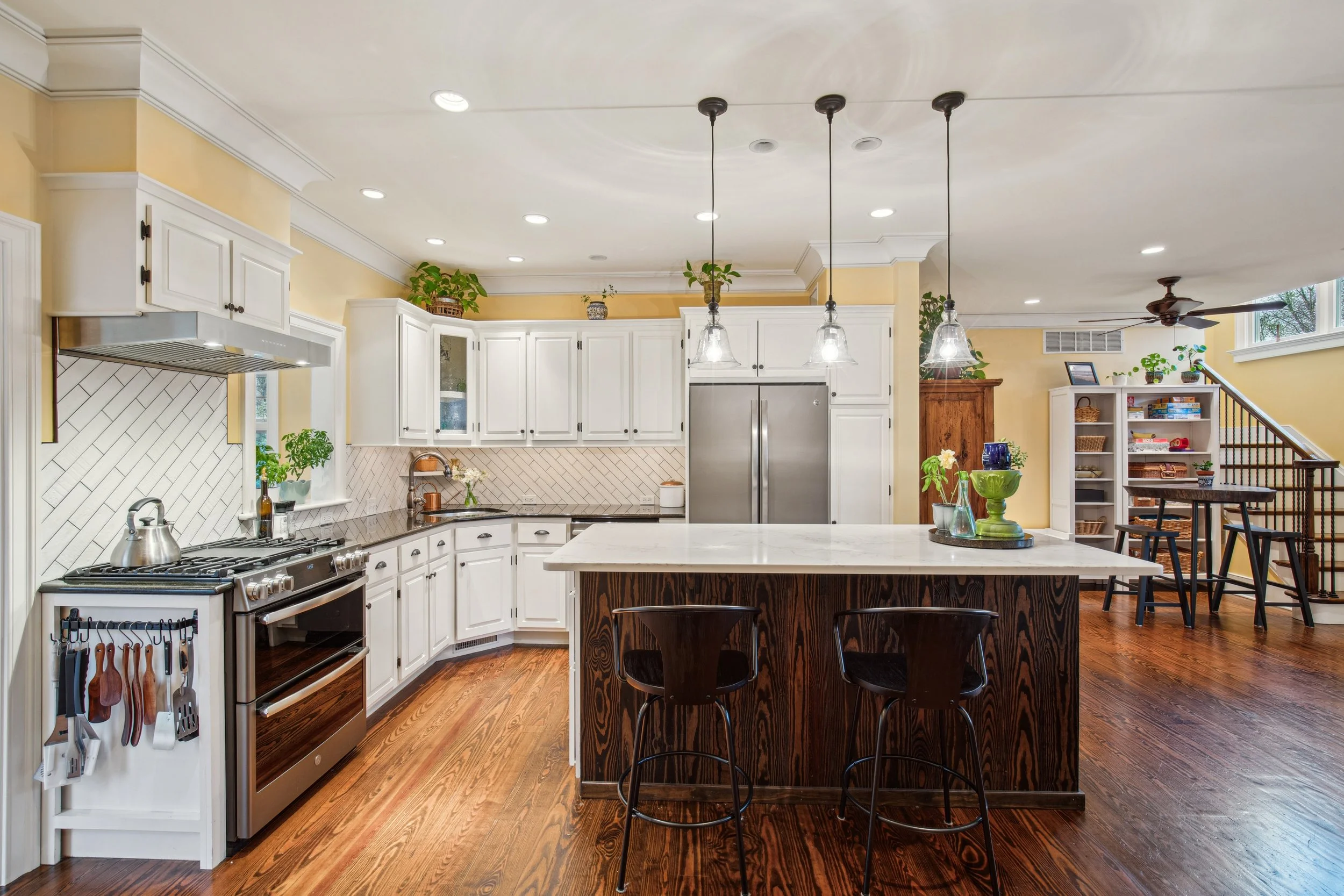 The kitchen is truly the heart of the home and a standout feature. Granite countertops, stainless steel appliances, and a striking quartz island create a perfect blend of style and functionality. The gas stove is a dream for any home chef, while the classic subway tile backsplash adds symmetry and timeless appeal.