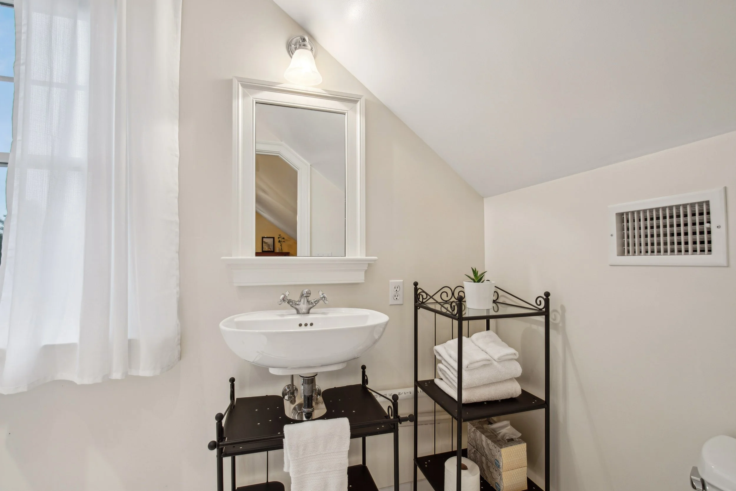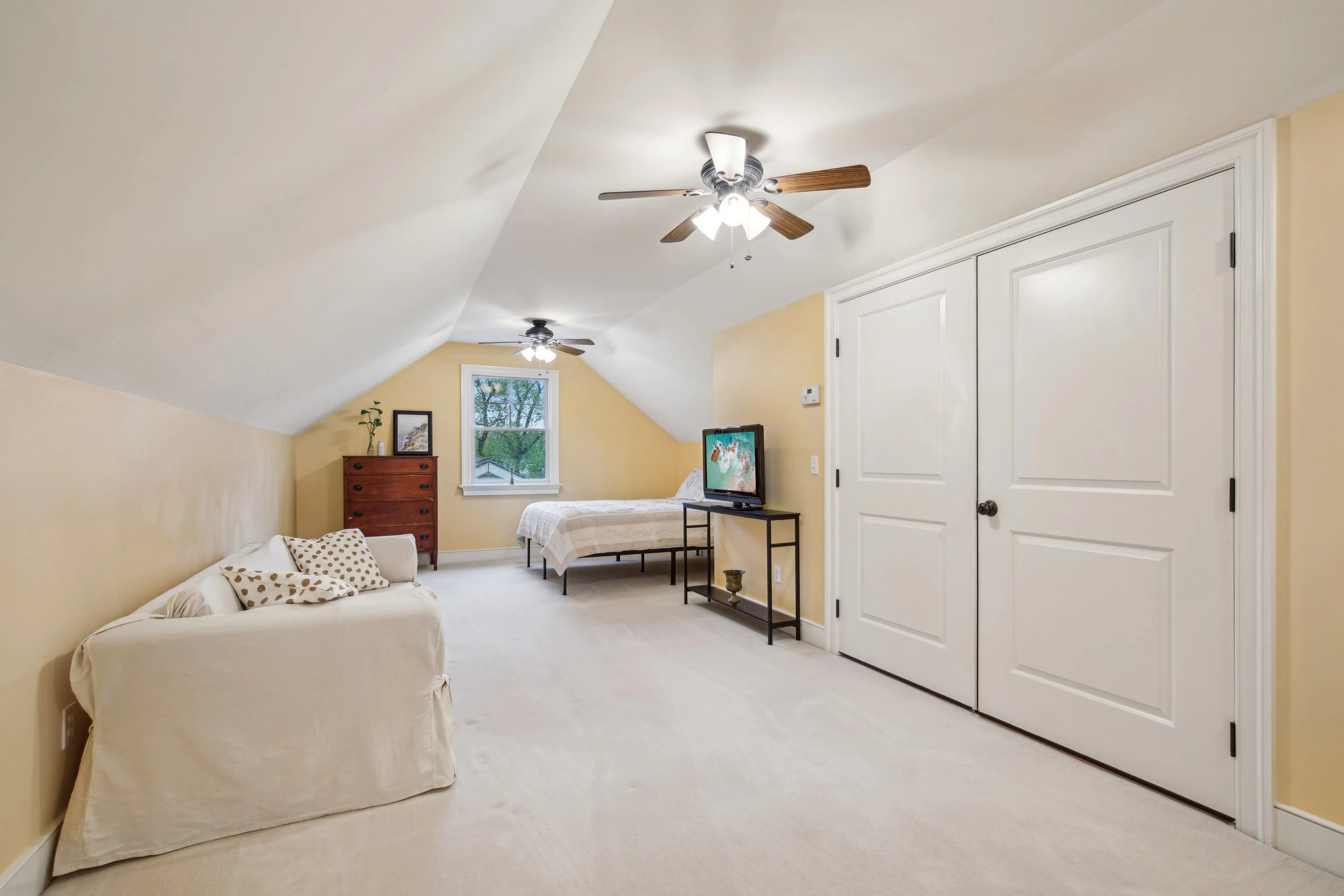 At the end of the hallway, a spiral staircase leads to a private third-level retreat. This space includes a spacious guest bedroom with an attached bathroom, offering enough room for a bed, seating area, and entertainment setup. The bathroom features a stand-up shower, floating sink, and portable storage solutions that balance practicality with modern design.