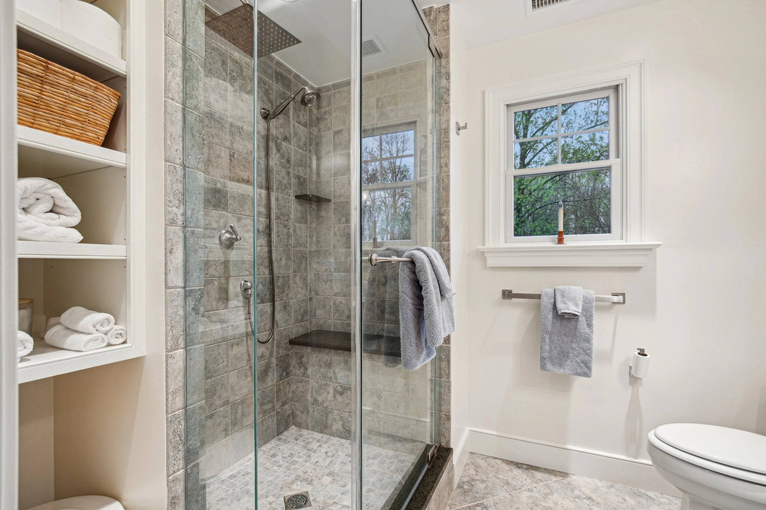 Upstairs, the primary bedroom is a true highlight. There’s ample space for a king-sized bed along with a built-in office area, making it both comfortable and functional. The en-suite bathroom feels like a private spa, featuring a large shower with dual shower heads, soft gray tile, and plenty of storage both inside and outside the shower.