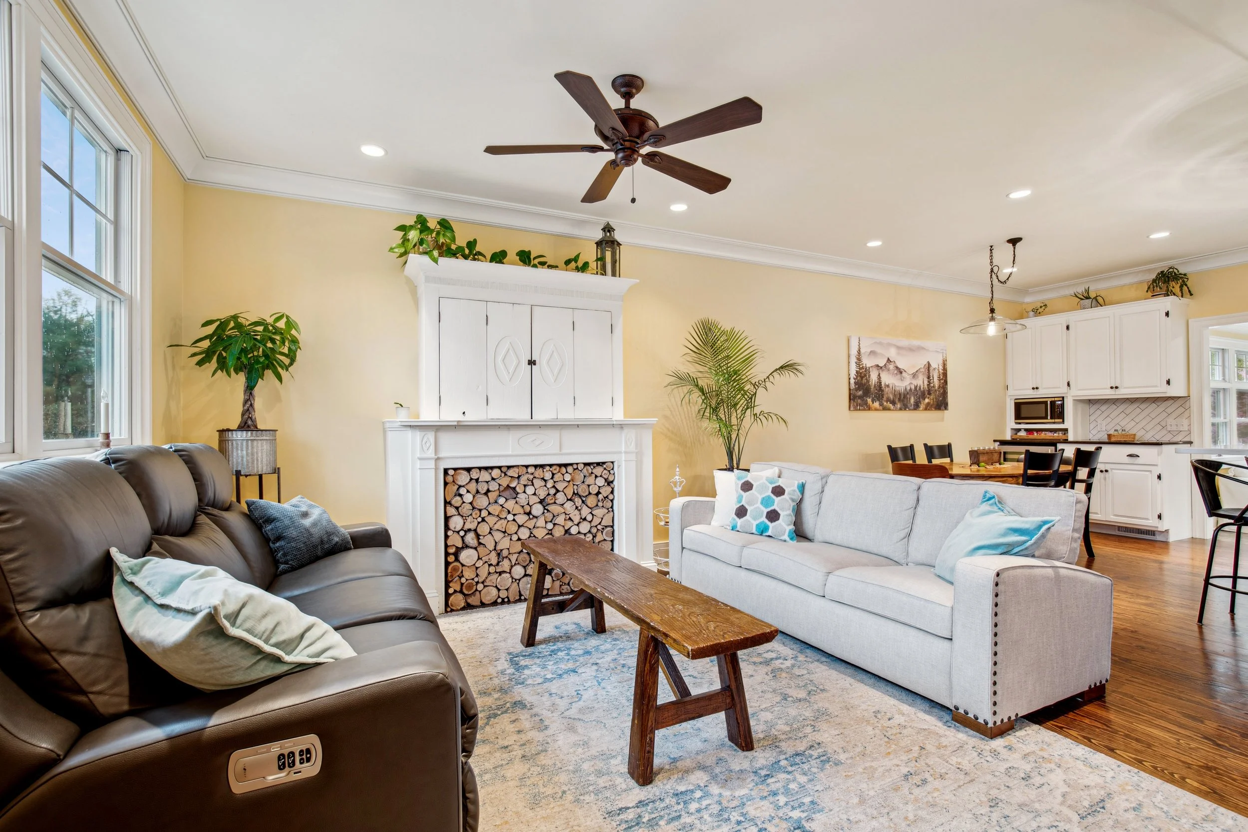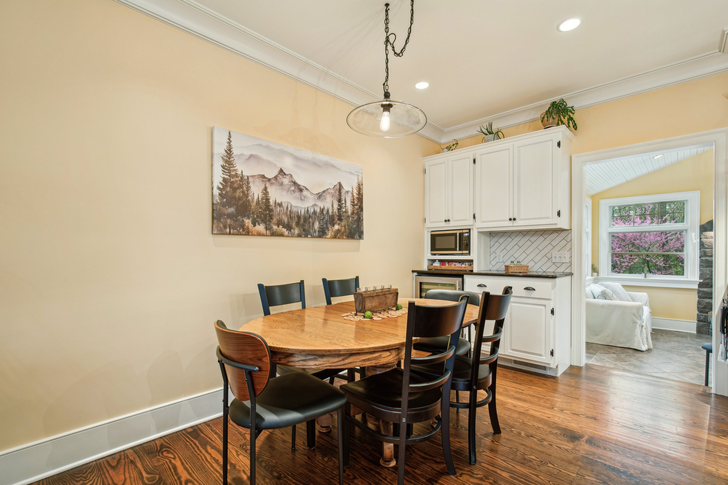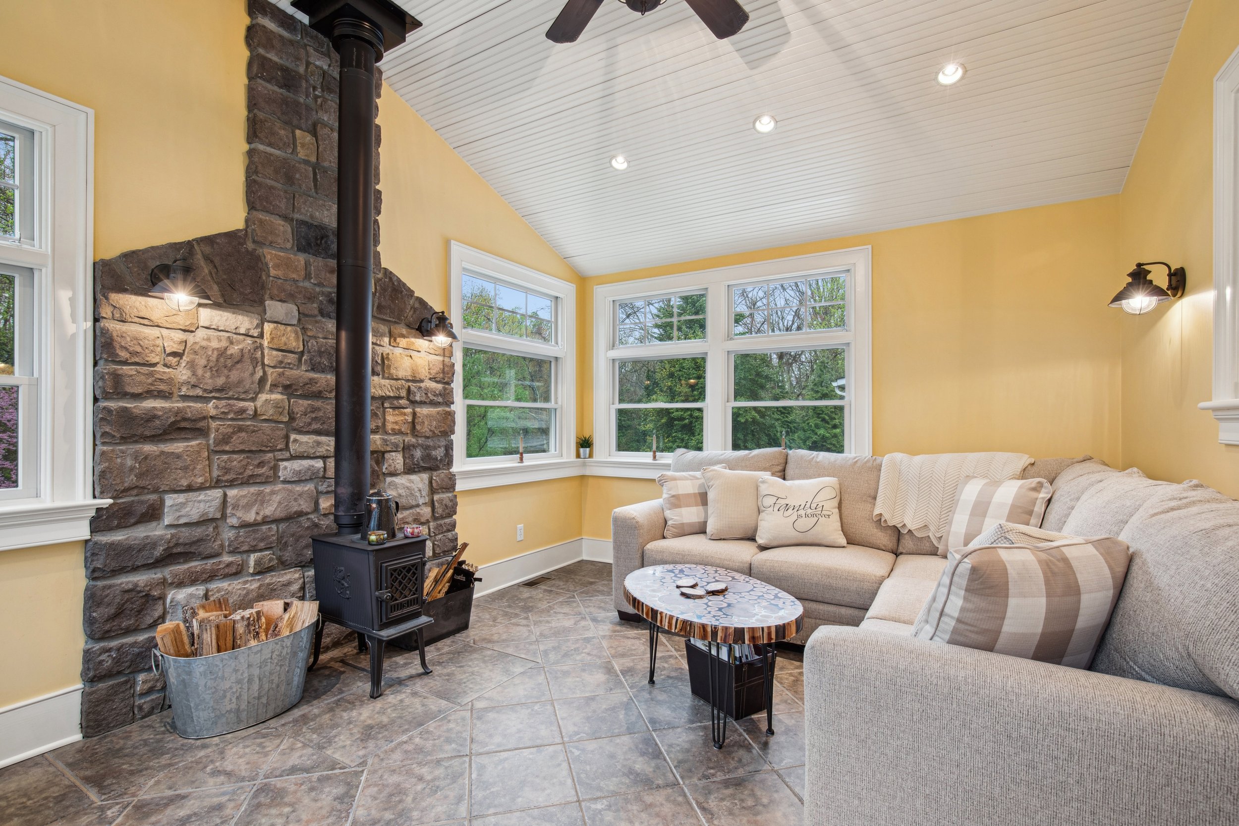 Just off the kitchen is the dining room, where the open layout allows for easy conversation—whether you’re cooking dinner or hosting a gathering. Beyond the dining area, the sunroom offers a warm and inviting retreat. With windows on three sides, the space is flooded with natural light, and a charming wood-burning stove makes it especially cozy during the winter months.