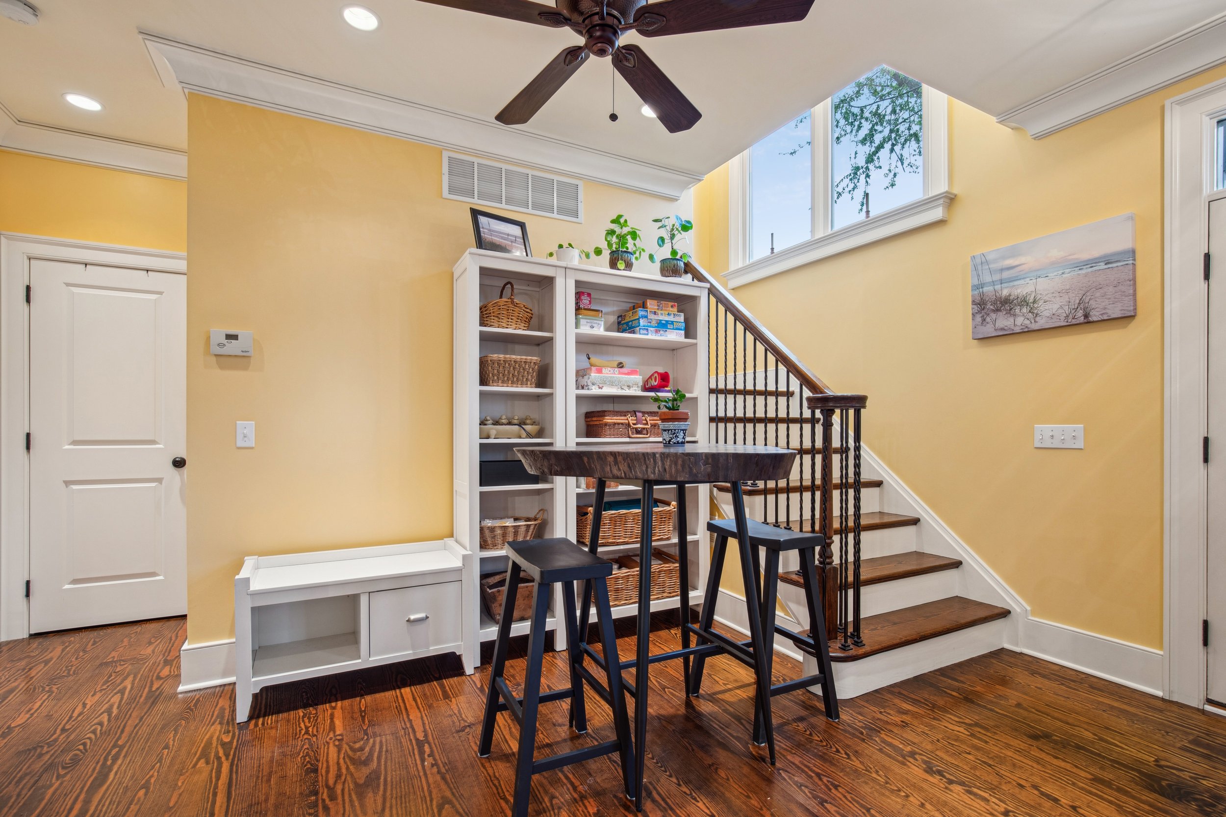 Once indoors, the beauty continues. The entryway opens into a bright, open-concept living area that feels both welcoming and spacious. The living room features a decorative fireplace, large picture windows, and elegant crown moulding throughout. One of my favorite spots to photograph was the breakfast nook tucked beside the staircase—a wonderfully versatile space that can function as a cozy dining area or a stylish entryway catch-all. It’s easy to imagine enjoying a quiet morning coffee here.