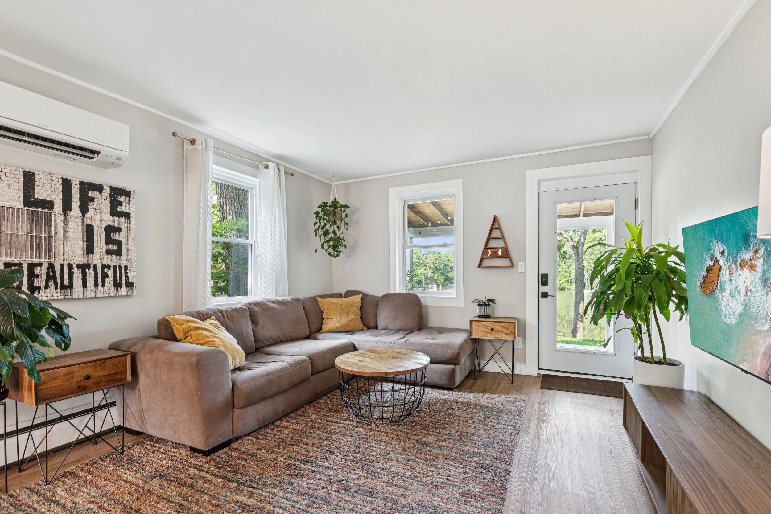 The transition from the kitchen to the open-concept living area is seamless. Despite the home’s cozy dimensions, the space feels expansive thanks to a flood of natural light. The real showstopper is the water view. The living room provides a front-row seat to spectacular summer sunsets. With a French door leading out to the deck, the line between indoor comfort and outdoor beauty completely disappears.