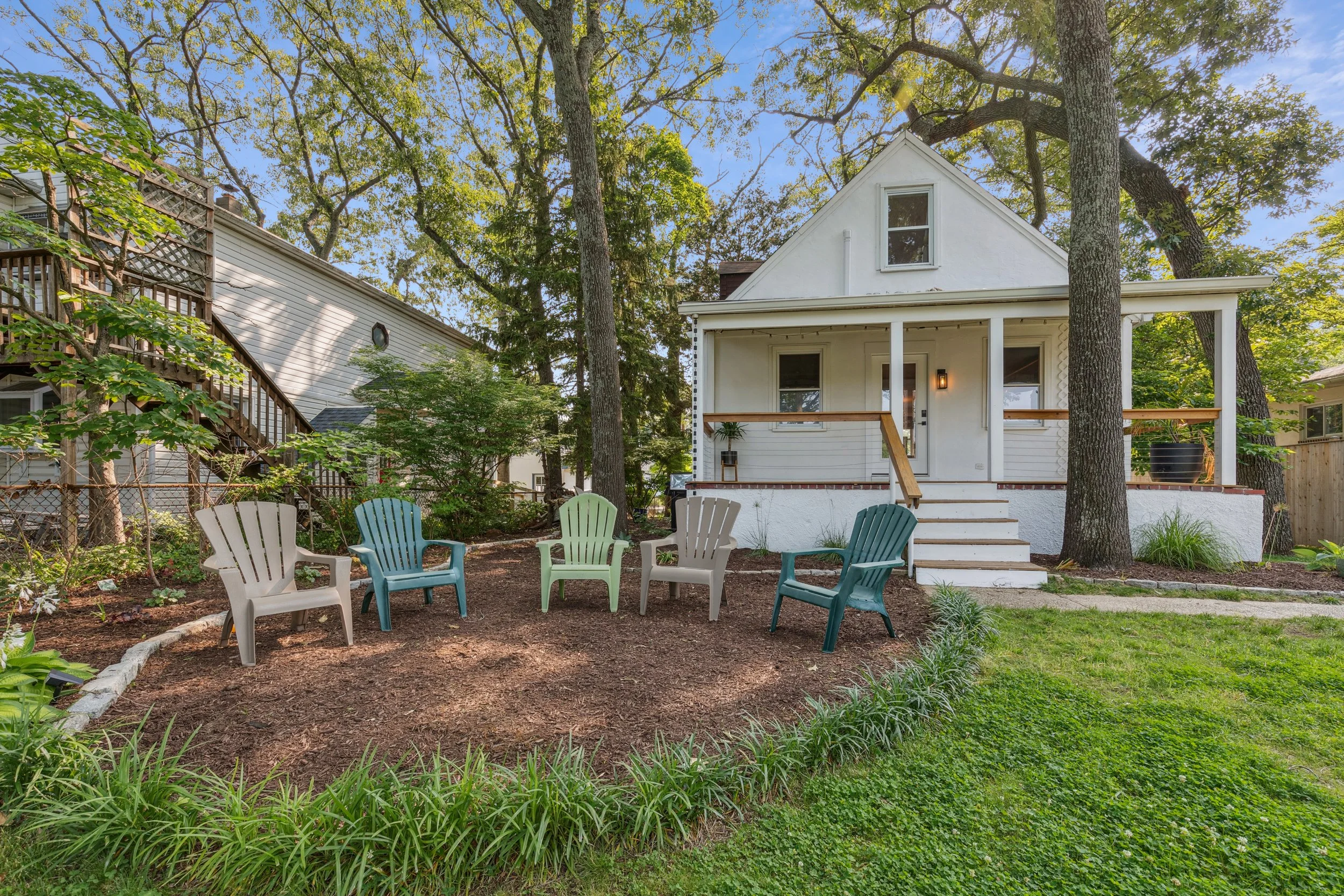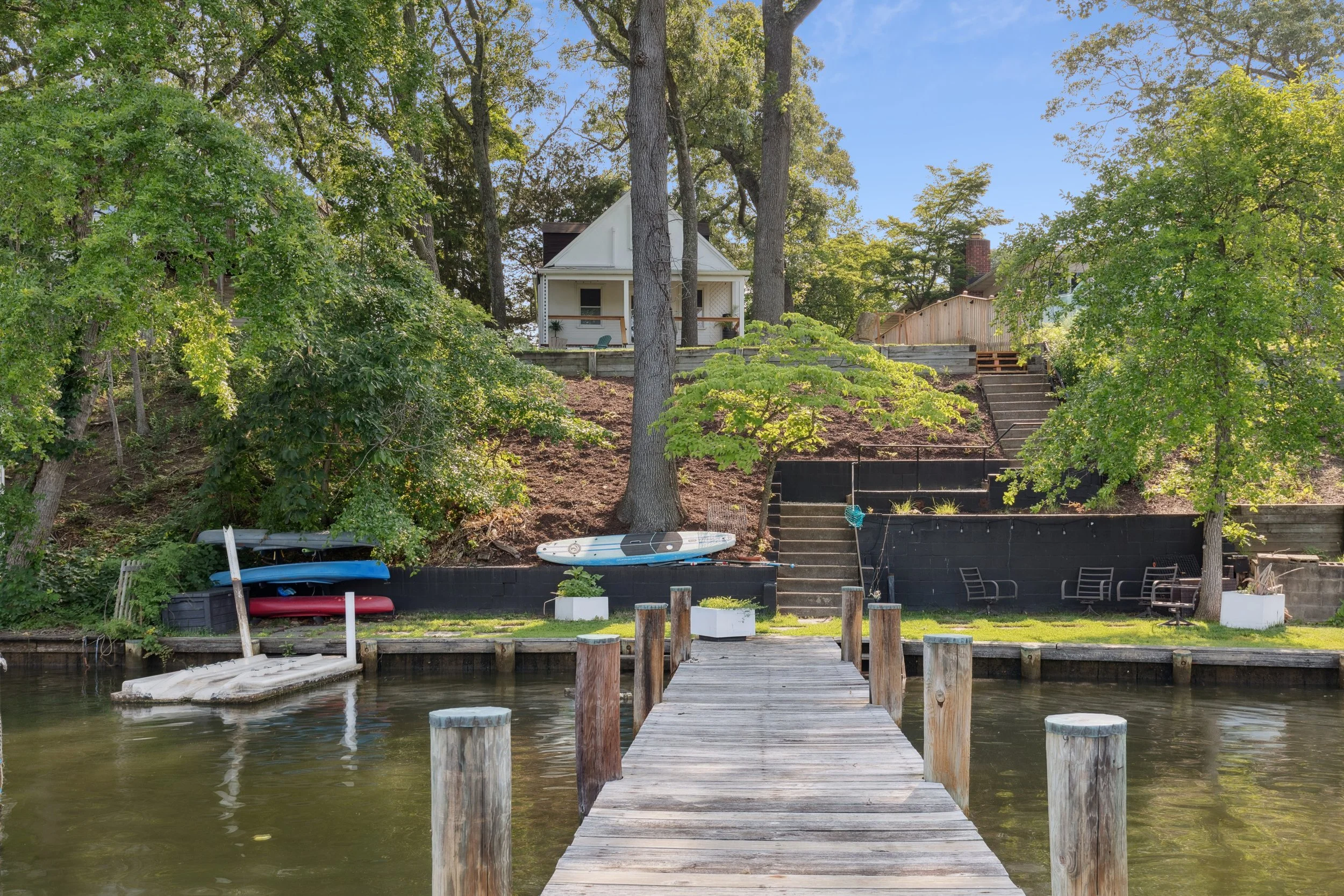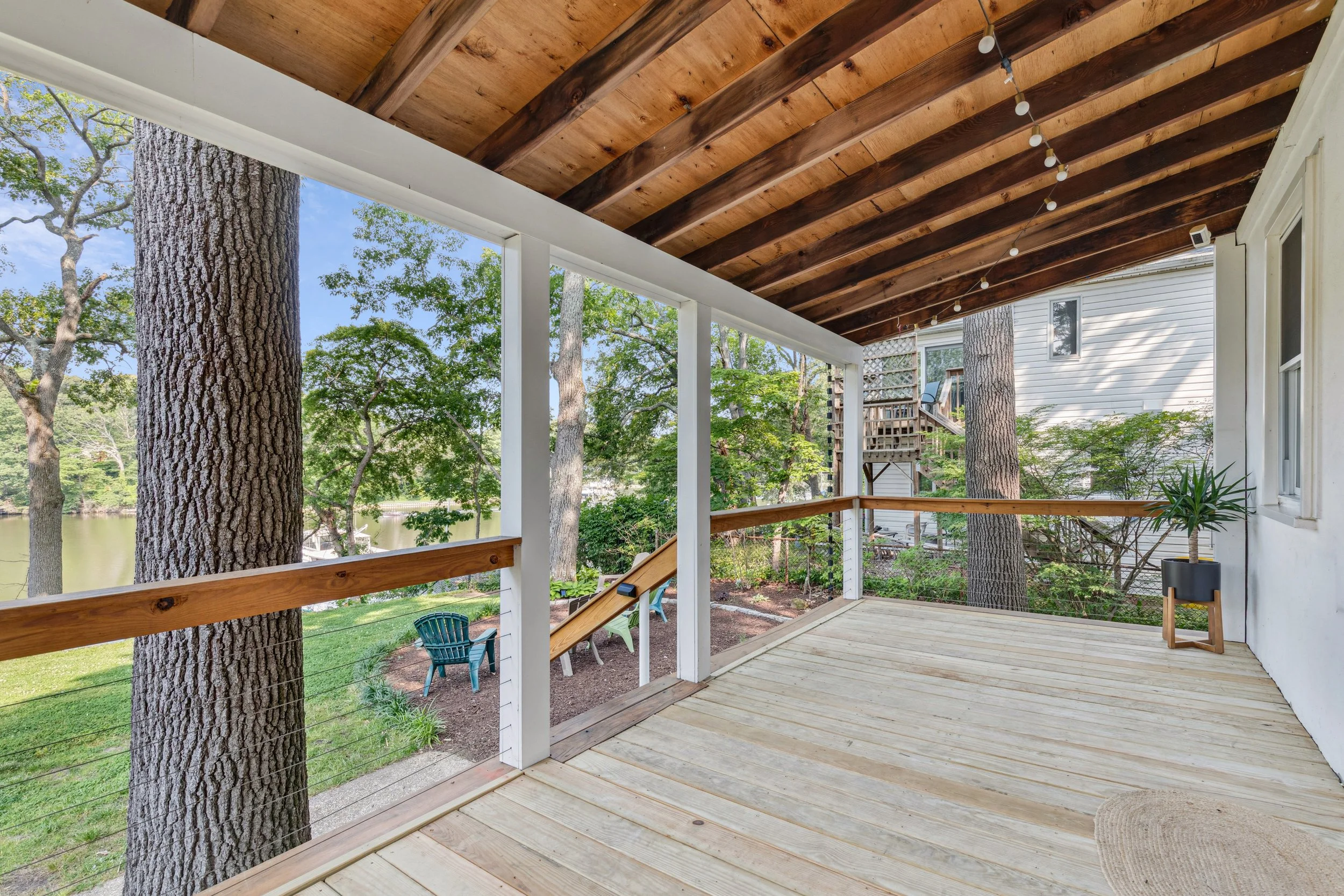 If the interior is the heart of the home, the backyard is its soul. It is quite simply sublime. For those who love the Chesapeake lifestyle, this property packs in every must-have feature including a private dock, a dedicated kayak rack for morning paddles, and a lower patio designed for quiet reflection overlooking the water. There is even an inviting fire pit area nestled just beyond the deck. The deck itself is an architectural highlight, featuring a rich wooden ceiling and light wood flooring that creates a warm and sophisticated outdoor room. Whether you are hosting a mid-summer crab feast or enjoying a quiet morning coffee, the versatility here is endless.
