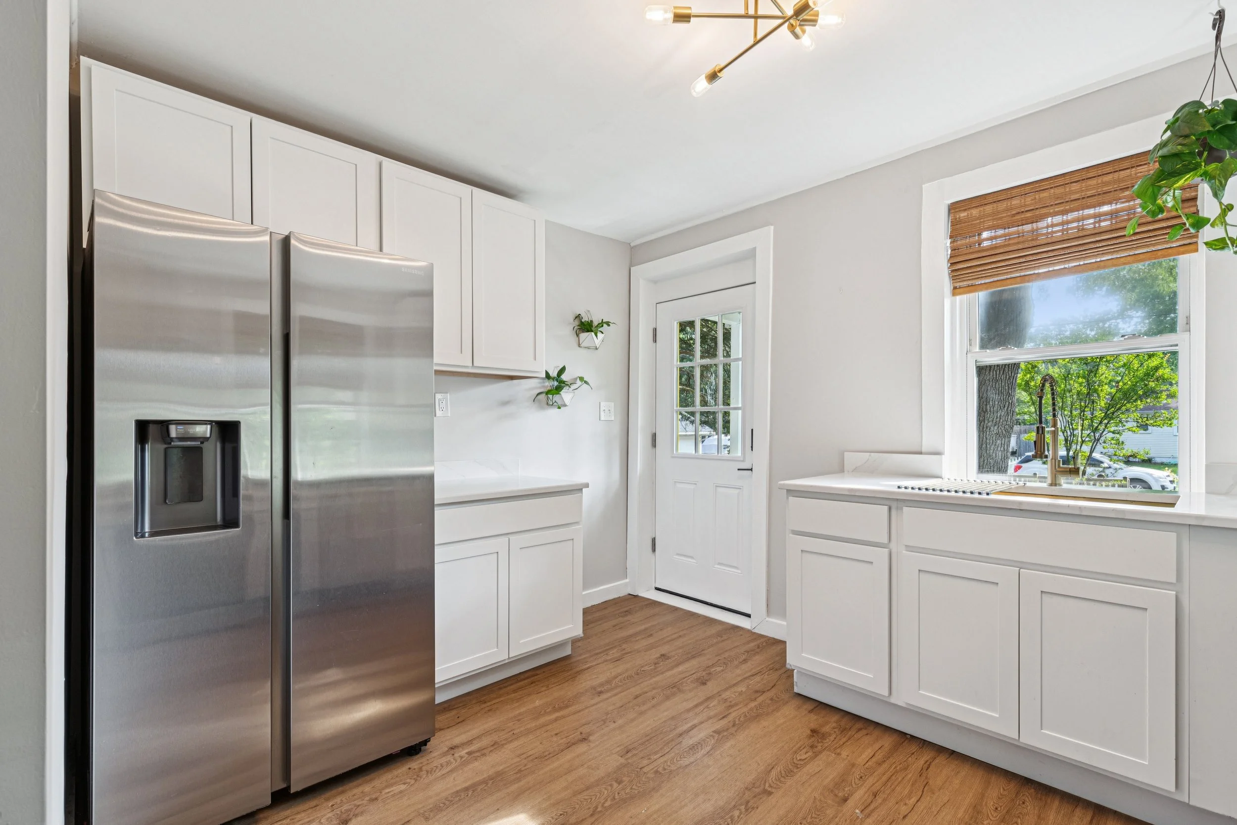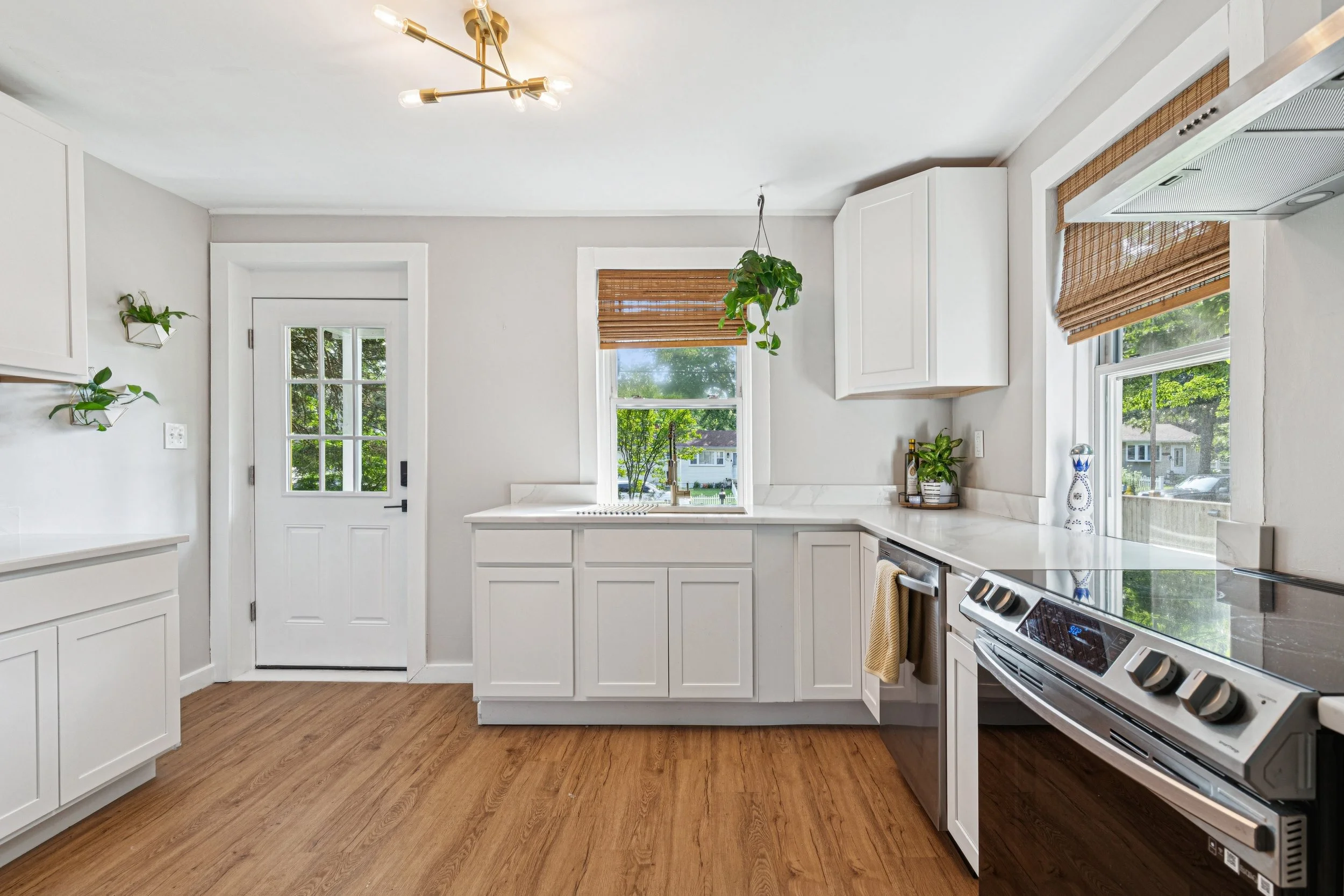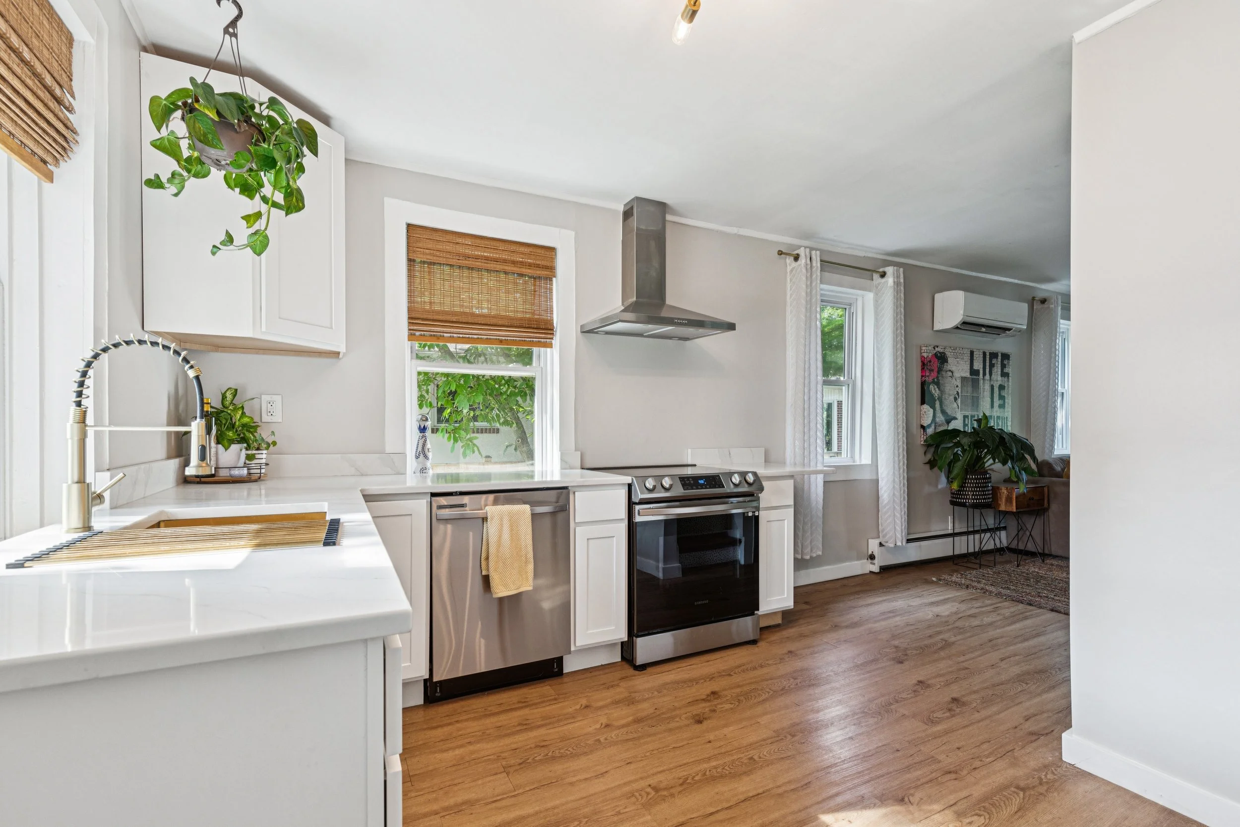 The moment you cross the threshold, you are greeted by a masterclass in modern renovation. The kitchen is a luxury workspace featuring white cabinetry paired with elegant white quartz countertops. The professional grade accents like the sleek electric stove and gourmet hood serve as the room’s focal point. I was particularly struck by the oversized sink. The black and silver high-arc faucet gives off high-end bistro vibes that photograph beautifully.