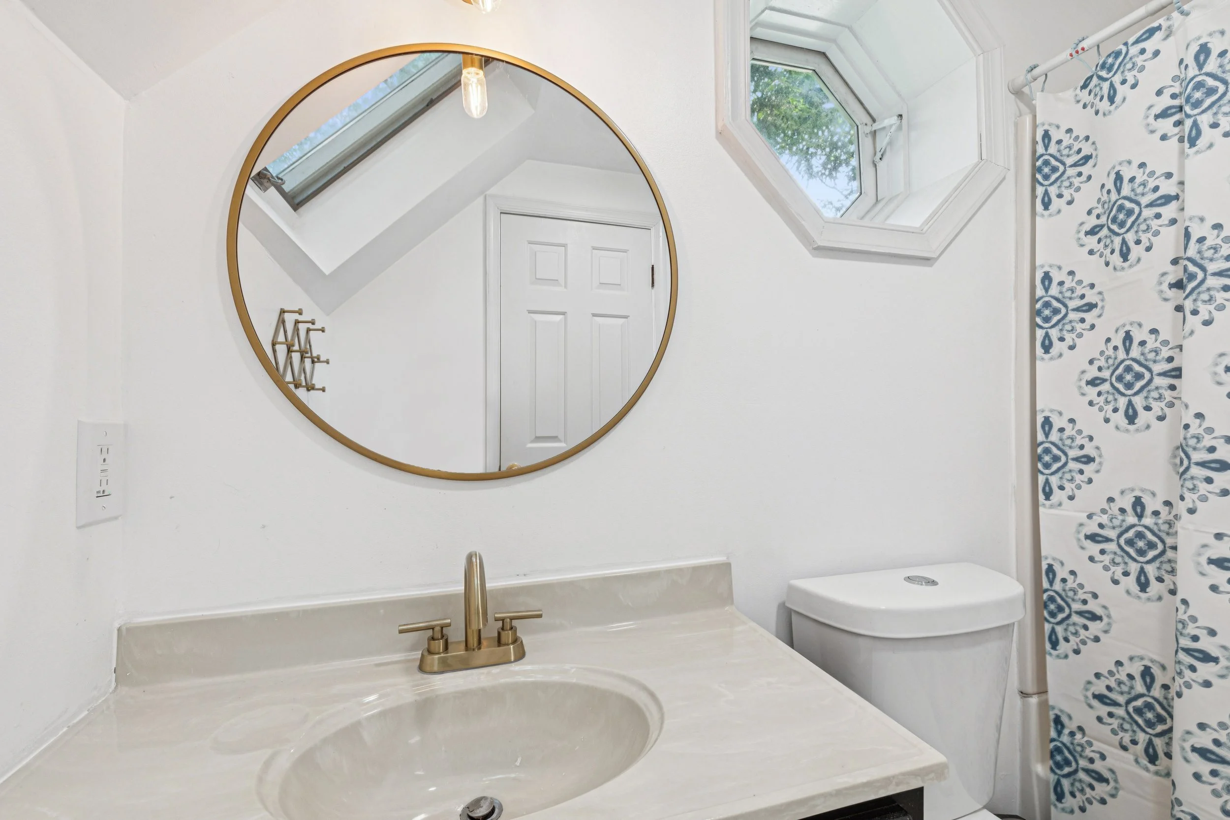 Heading upstairs, the primary suite continues the luxury-in-miniature theme. The Art Deco-inspired wood floors add a layer of vintage character, while the vaulted ceilings give the room an open and loft-like feel. The ensuite bathroom is a jewel box of design featuring trend-setting gold fixtures, a chic circular mirror, and a charming porthole window that acts as a subtle nod to the home’s nautical surroundings.